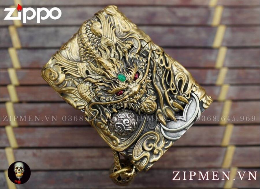 Mặt trước zippo có hình đầu tỳ hưu được đúc nổi hẳn lên và đính viên ngọc màu xanh làm điểm nhấn nổi bật, thêm những chi tiết rất độc đáo như mắt tỳ hưu có thể đổi màu, đuôi thì có gắn thêm lục lạc.