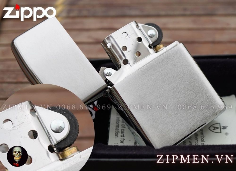 Là chiếc zippo phổ thông được đúc bằng đồng thau nguyên khối sau đó phủ 1 lớp chrome rất bền không bao giờ bong tróc rỉ sét theo thời gian, hai mặt chính trước sau được đánh nhám nên chống bám vân tay và chống xước khá tốt.
