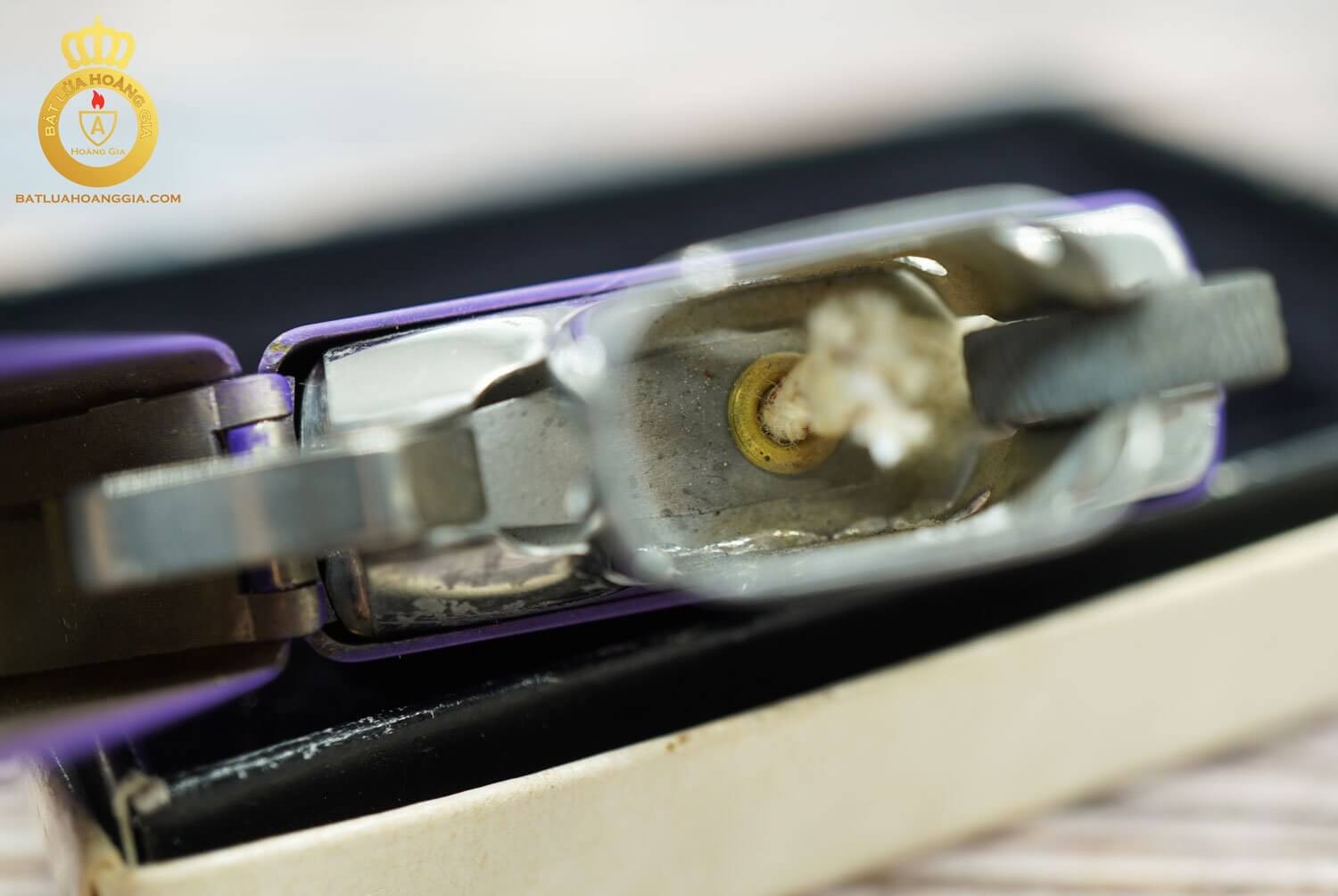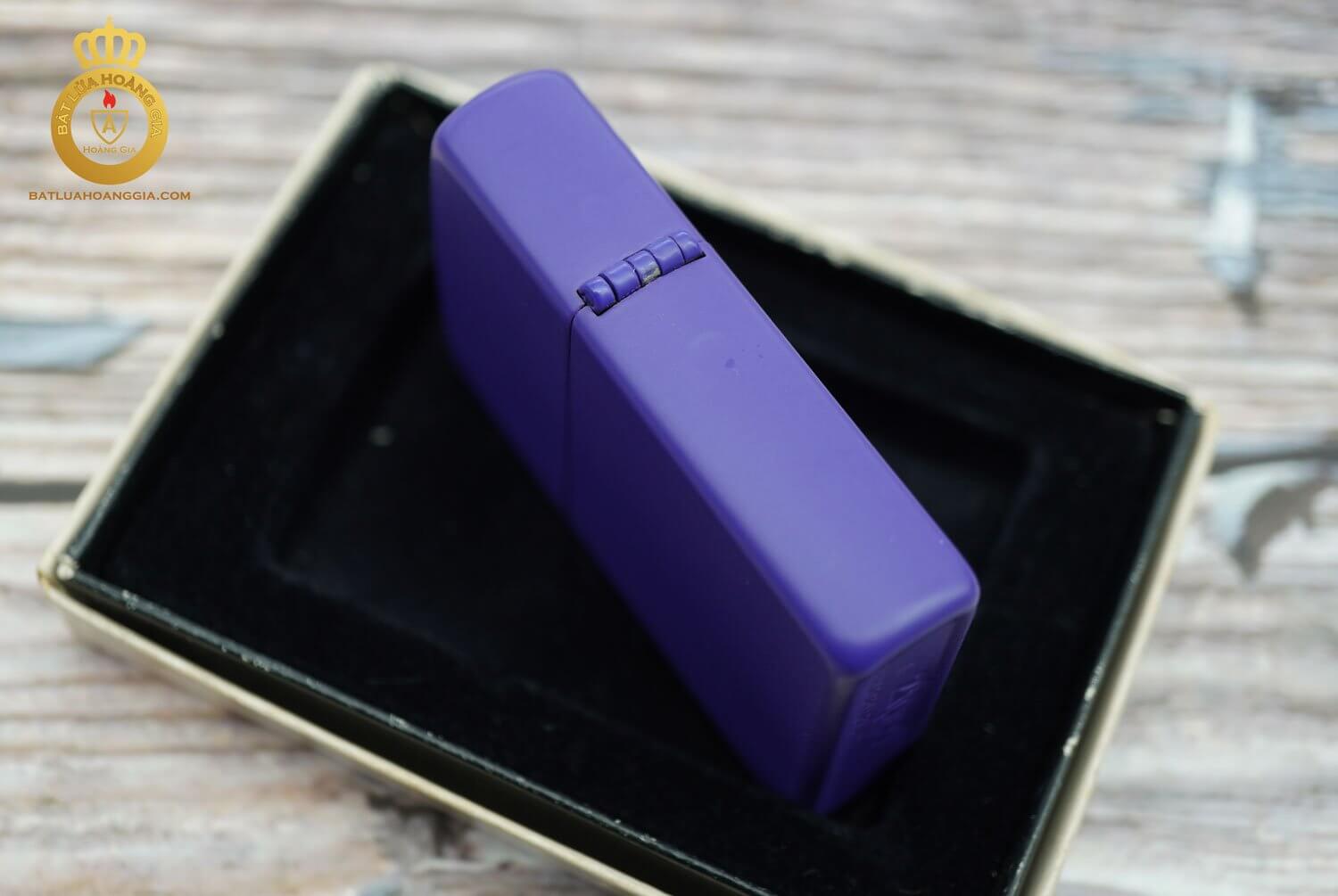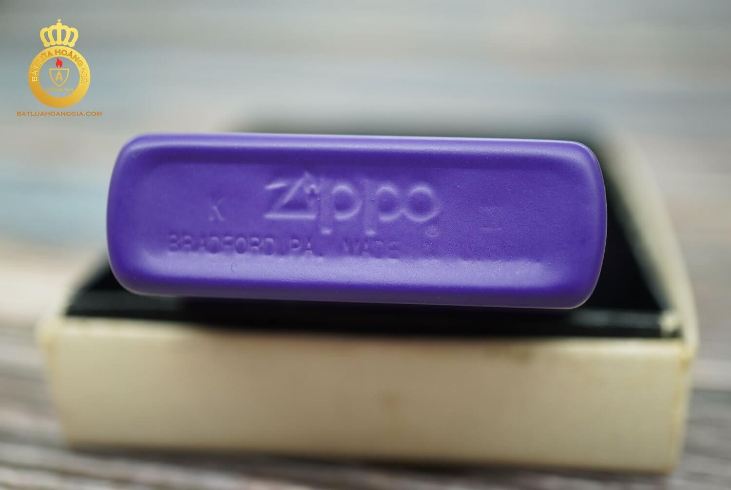 Chiếc zippo này có bề mặt gần như mới, có nguyên cả hộp.Với chất liệu là bằng đồng khối được bọc 1 lớp sơn tĩnh điện màu tím rất dầy và bền đẹp