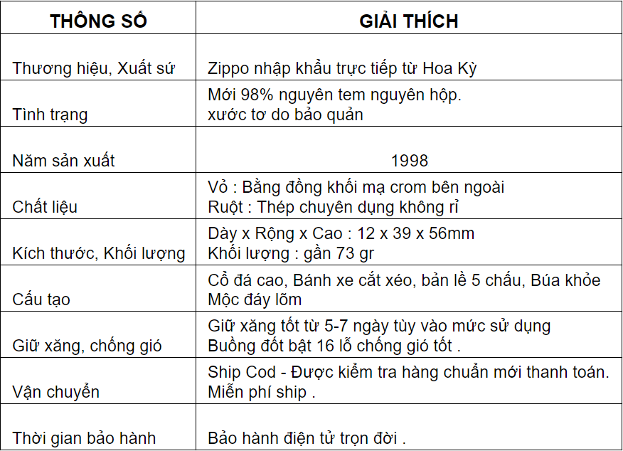 Lời kết: Anh em có thắc mắc gì về chiếc bật lửa Zippo USA cổ xưa này hay những sản phẩm khác như thông tin sản phẩm, bảo hành, cách mua hàng và thanh toán xin liên hệ: