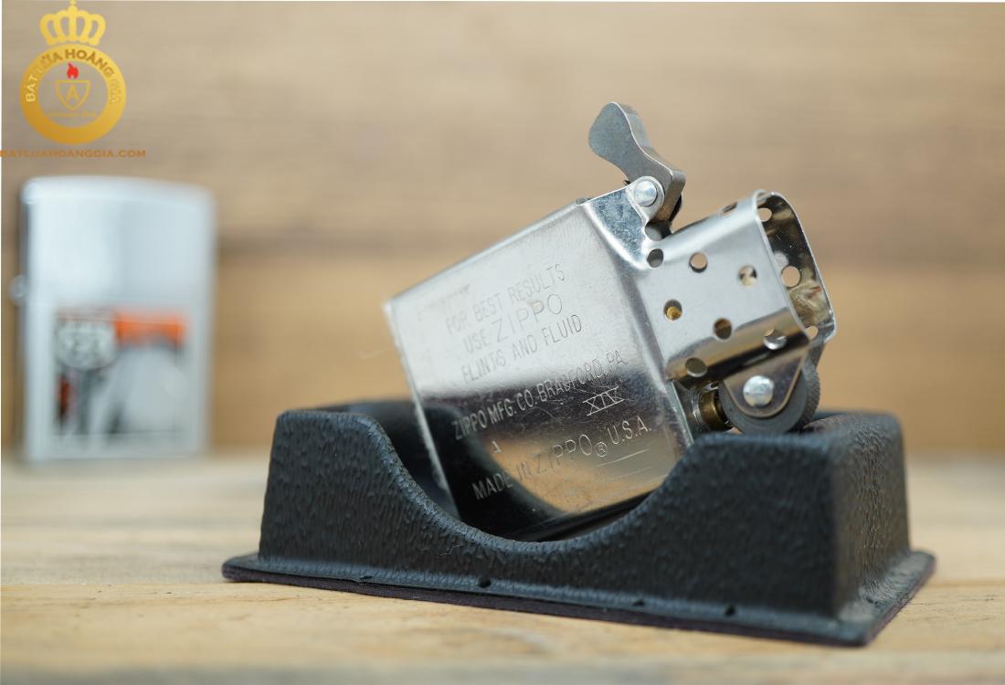Cổ đá chiếc zippo được chế tác từ đồng, bán xe cắt xéo sâu và sắc sảo, còn rất mới và nhạy lửa.