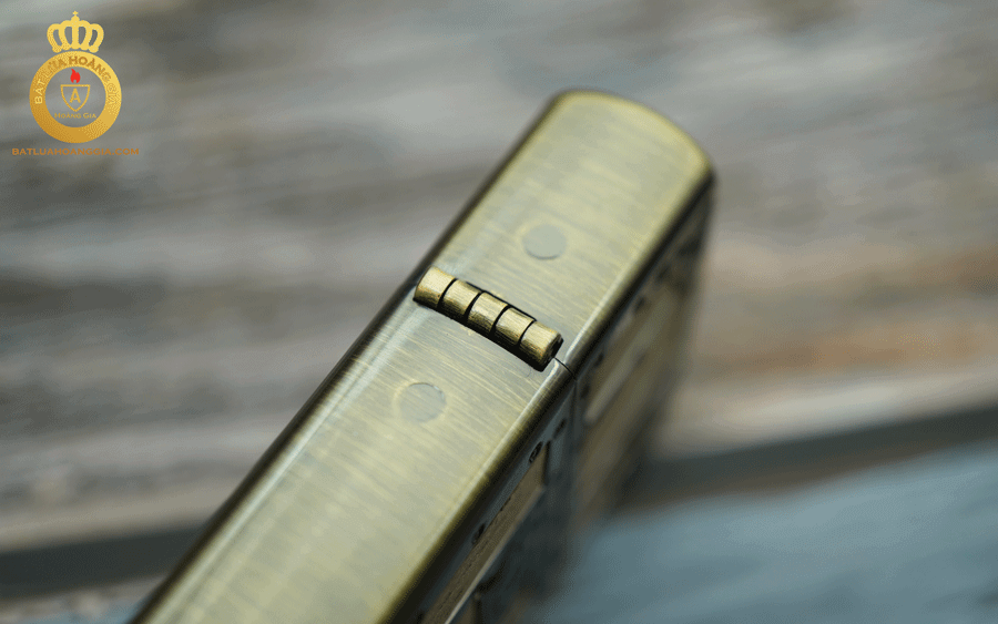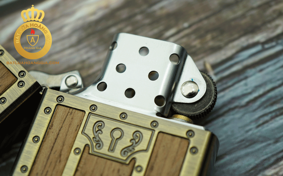 Không kém cạnh gì đàn anh Zippo USA cây bật lửa Zoro đồng ốp gỗ này cũng có bản lề 5 chấu đều tròn kín khít mang lại hiệu quả cầm xăng tốt từ 5-7 ngày và sự chắc chắc khi bật nắp.