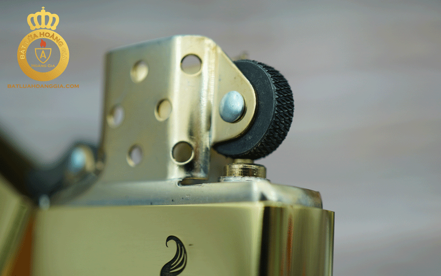 Bên cạnh đó chiếc Zippo cao cấp còn có cổ đá cao màu vàng làm bằng đồng rất tròn, bánh xe của zippo thì cắt xéo sâu hình quả trám rất sắc sảo và rất bén nên độ nhạy lửa phải gọi là tuyệt vời.