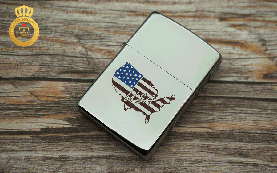 Mặt trước Zippo USA này khắc chìm và đổ sơn hình cờ lá cờ nước Mỹ rất sắc nét và rất bền không thể bị bong chóc ra.