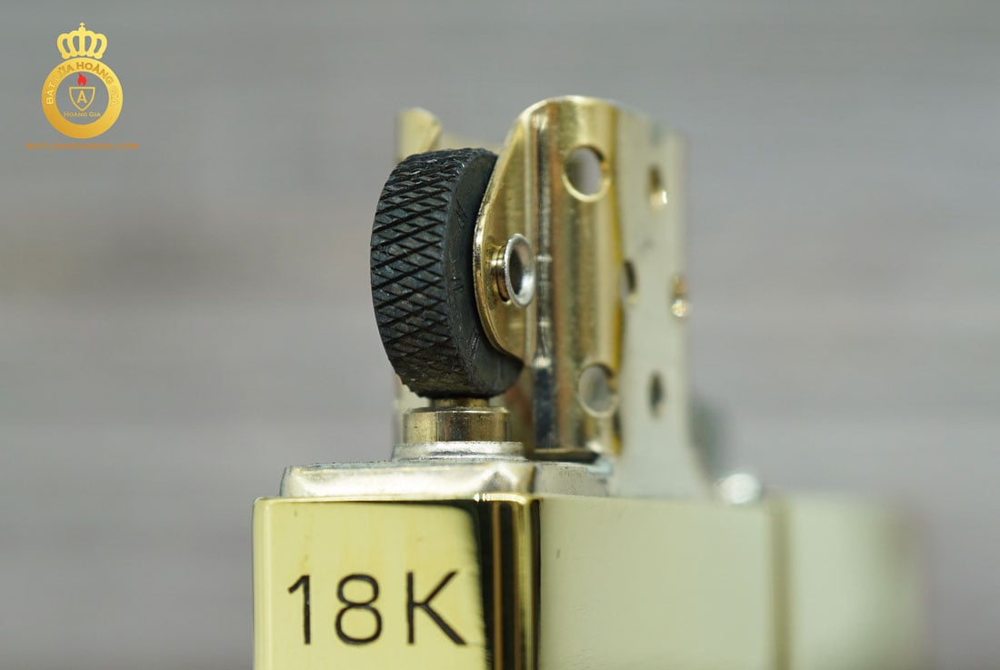 Bên cạnh đó chiếc Zippo cao cấp này còn có cổ đá cao màu vàng làm bằng đồng và rất tròn trĩnh. Bánh xe vẫn là thiết kế đặc trưng của zippo chính hãng: cắt xéo sâu hình quả trám rất sắc sảo và rất bén nên độ nhạy lửa phải gọi là tuyệt vời.