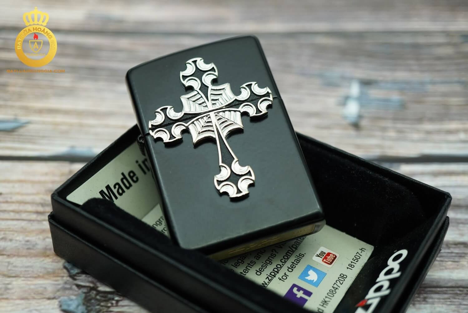 Sét Zippo này được làm bằng đồng nguyên khôi và được bọc 1 lớp sơn tĩnh điện màu đen rất đẹp, mặt trước được đính Emblem hình cây Thánh Giá
