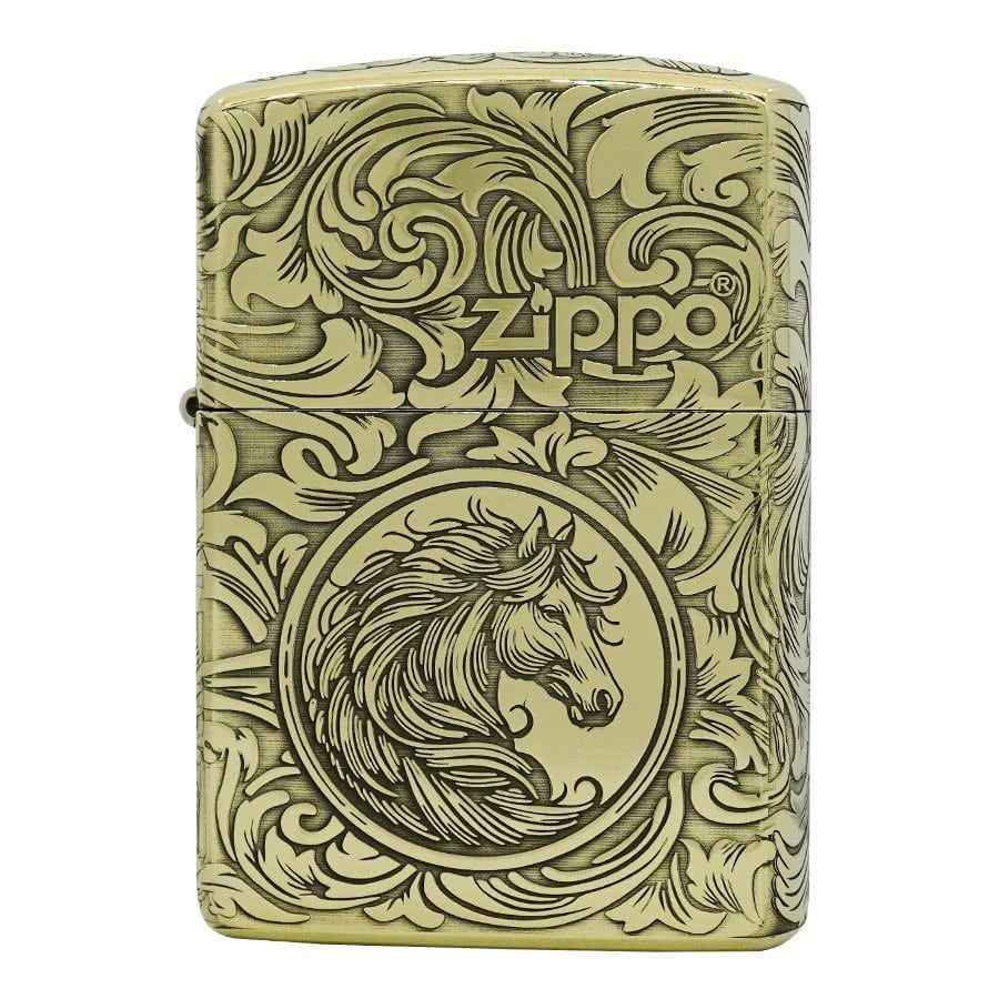 Mặt trước chiếc Zippo được khắc hình con ngựa chính giữa đan xen với hoa văn chìm nổi, với logo zippo phía trên. Hình ảnh chú ngựa mạnh mẽ nhiệt huyết, toát lên khi chất của người sở hữu.