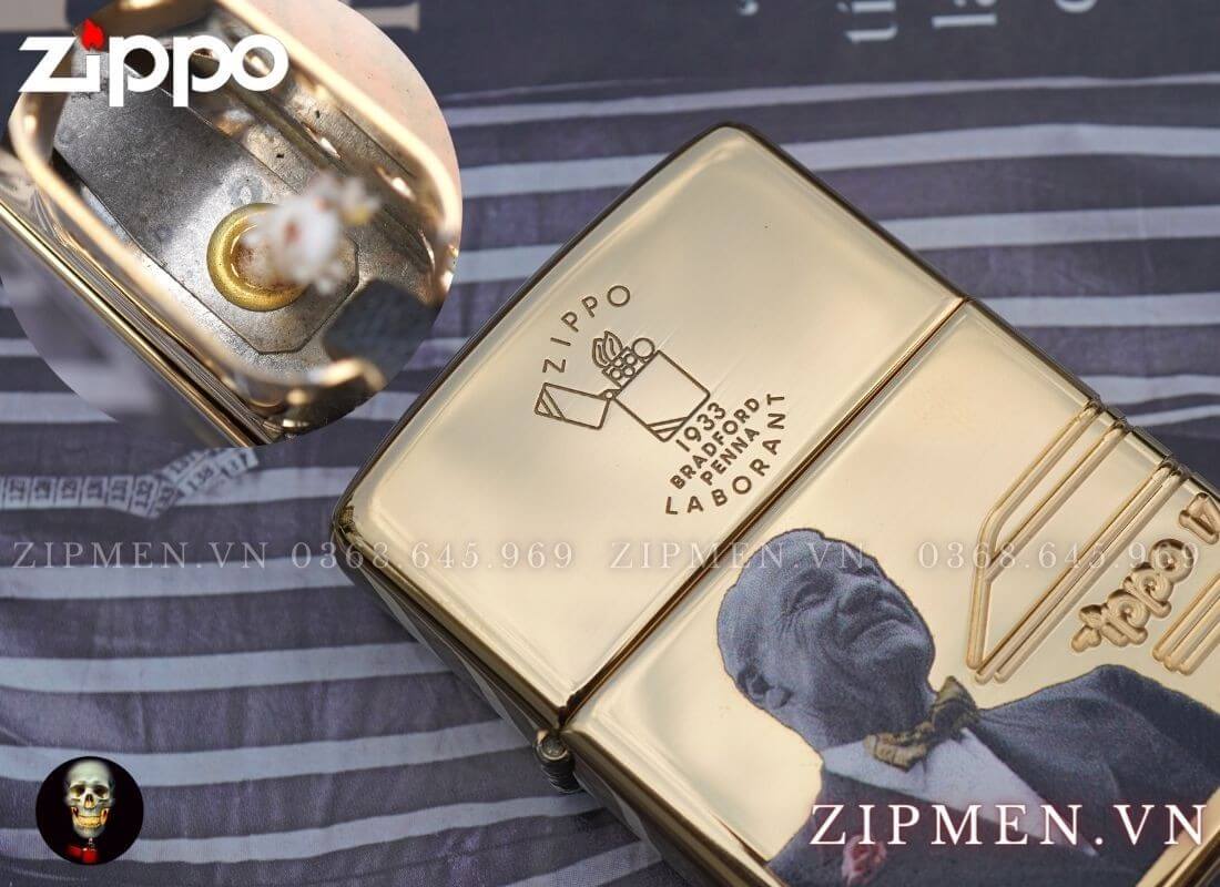 Điểm nổi bật ở đây là chiếc hộp quẹt còn được in cả hình của người sáng lập ra công ty zippo, lớp sơn in rất bền nếu những ai sử dụng giữ gìn cẩn thận tránh trà sát thì không dễ dàng bị bong tróc được anh em nhé.