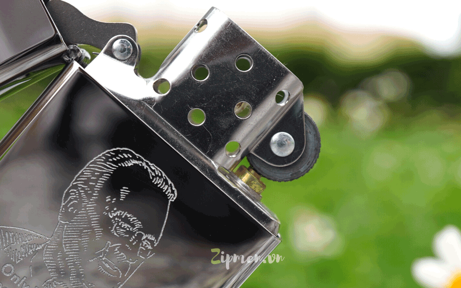 Bên cạnh đó chiếc Zippo còn có cổ đá cao màu vàng làm bằng đồng rất tròn, bánh xe của zippo thì cắt xéo sâu hình quả trám rất sắc sảo và rất bén nên độ nhạy lửa phải gọi là tuyệt vời, lên lửa chỉ chưa một vòng xoay.