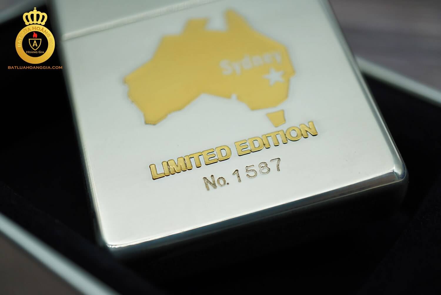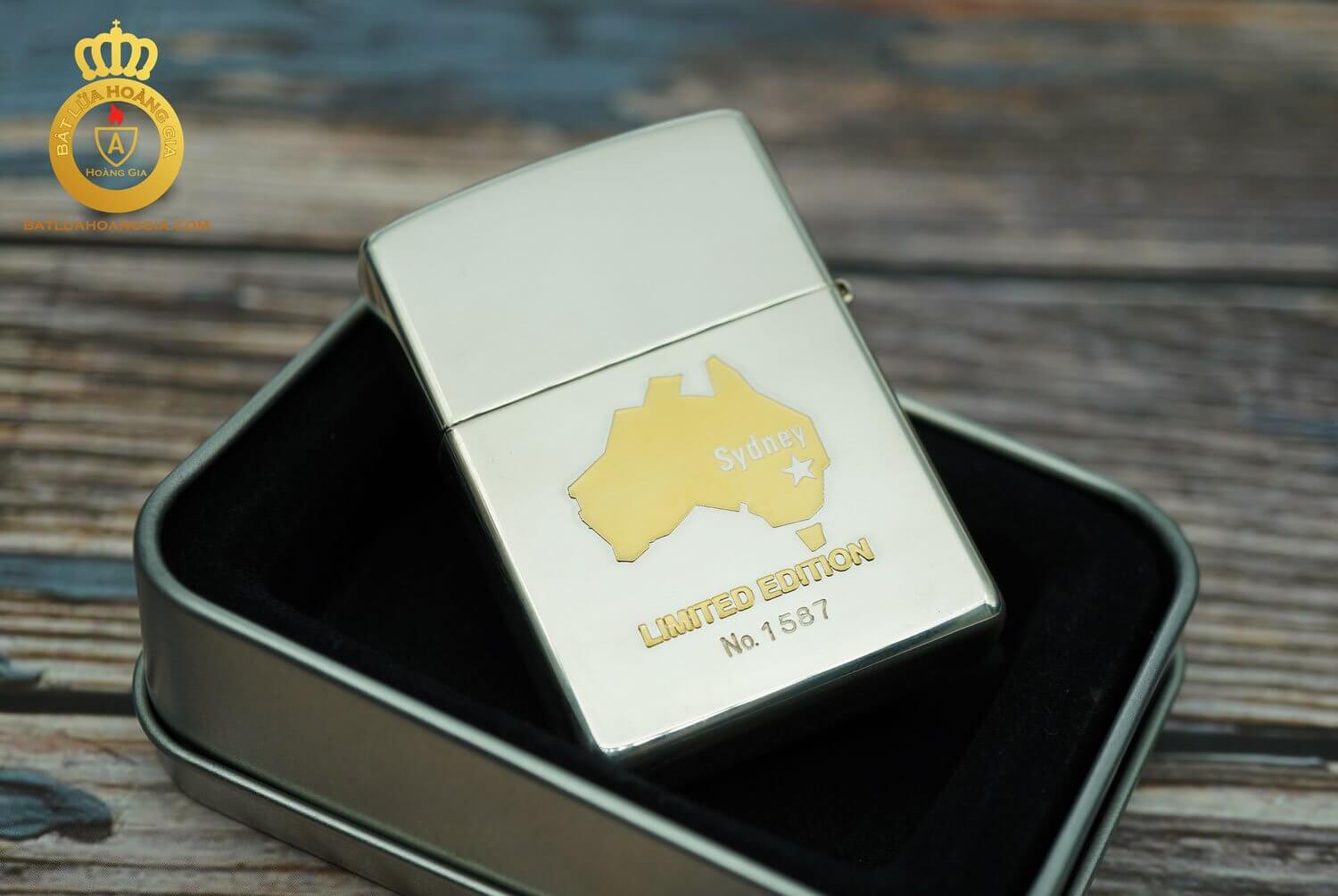 - Mặt sau của chiếc Zippo cổ này đươc khắc axit ăn mòm bản đồ nước ÚC và được mạ vàng 18k lên trên bề mặt khắc