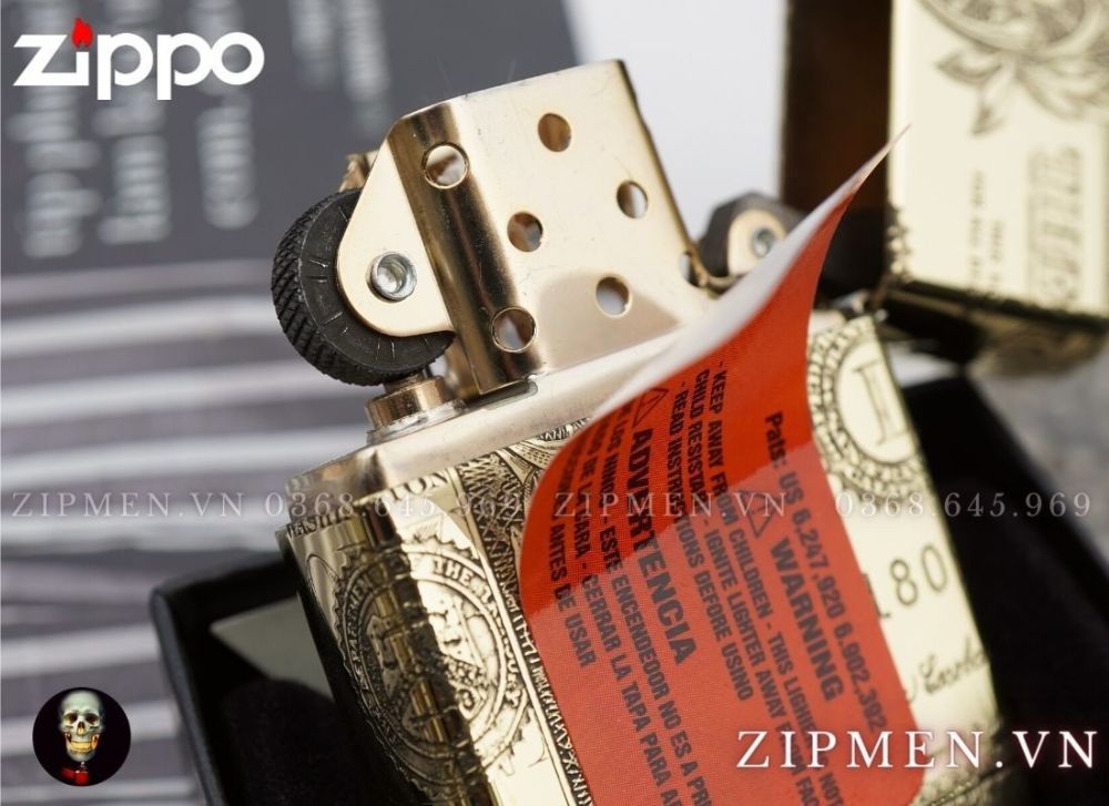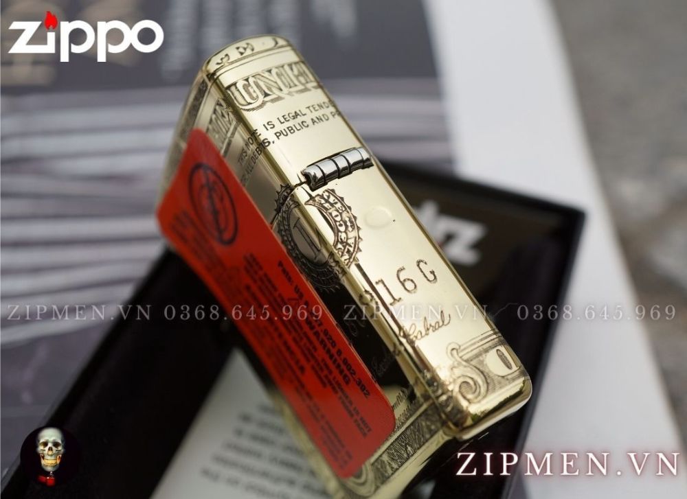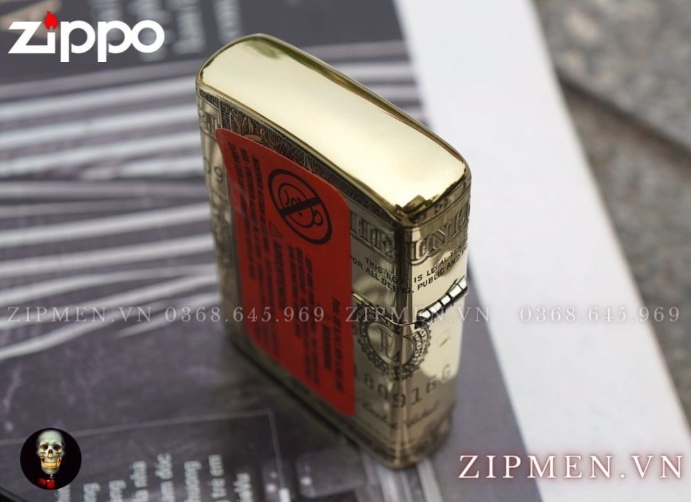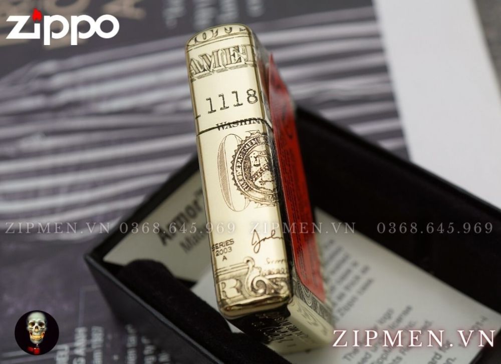 Đây là chiếc zippo cao cấp rất đẹp mô phỏng tờ tiền một dollar của nước Mỹ trên chiếc bật lửa. Hình ảnh tờ tiền được cuốn bao quanh chiếc hộp quẹt và mặt trước là hình tổng thống Mỹ Washington.
