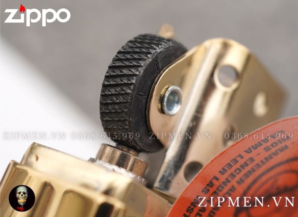 Tiếp theo là cổ đá cao, màu vàng được làm bằng đồng, tròn, bánh xe được cắt xéo sâu, sắc nét hình caro rất bén vì vậy độ nhạy lửa phải gọi là tuyệt vời.